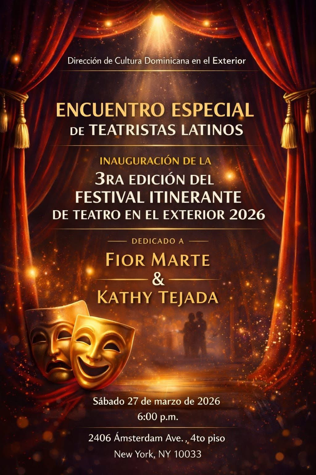La Dirección de Cultura Dominicana en el Exterior tiene el honor de invitar a la comunidad artística, cultural y al público en general a celebrar el Día Mundial del Teatro, en el marco de la inauguración de la 3ra edición del Festival Itinerante de Teatro en el Exterior (FITEX 2026), concebido como un encuentro especial de teatristas latinos en el exterior.